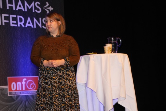 Ellen Bergsrønning kaller seg en super-strikkenerd når hun presenterer seg og sin bedrift Fortuna for 200 næringslivsfolk på Thamskonferansen 2020 i Orklahallen.