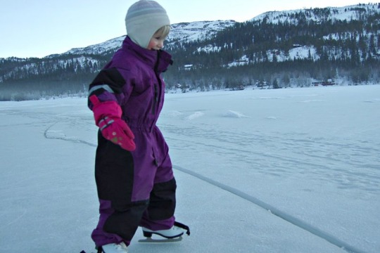 Vi møtte Marit og Thea Sørensen ute på Frilsjøen. De gikk på skøyter rett ned for feriestedet sitt ved Frilsjøen camping. Det var minus 10 grader og nå de ville inn og varme sine frosne på tær, etter ei god stund på skøyteisen.
