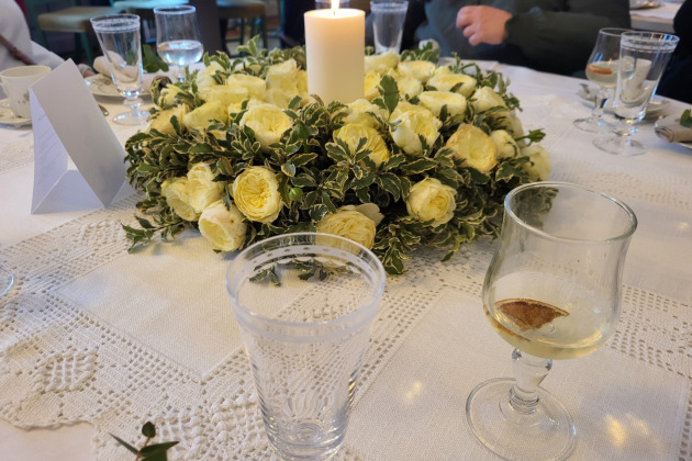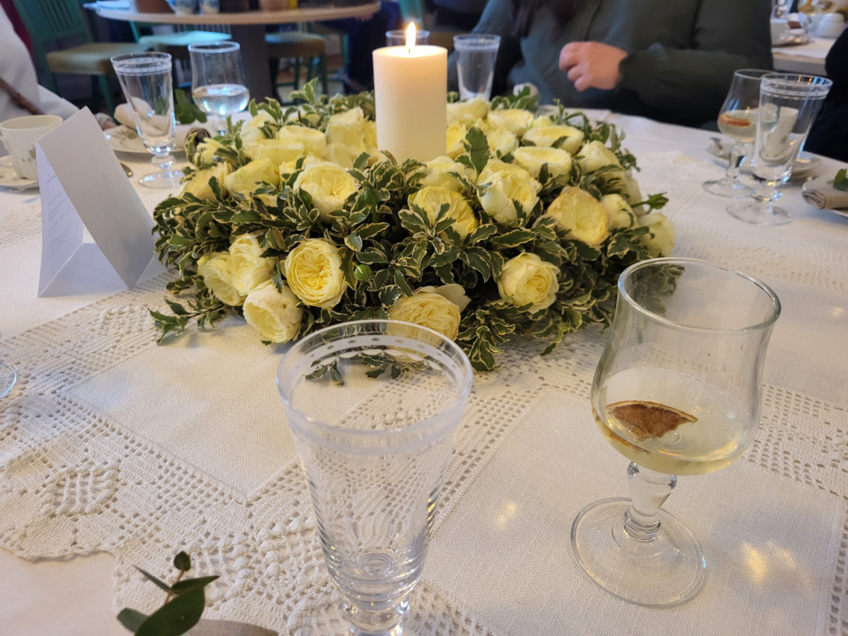 Jeg satte meg ved et bord med kopper som hadde en god hank å holde i. Det lærte jeg av min mor, at det er viktig. Serviset hadde et enkelt blomstermotiv og bordpynten var en krans av grenroser og litt grønt innimellom. Det var også glass til å ha «bobler» i, hvis du skulle ønske det!