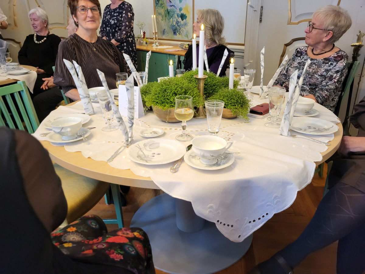 Vi ble møtt med et trivelig velkommen, mange smilende kjente fjes (de aller fleste) og en velkomstdrink. Så ble dørene til spisesalen åpnet og vi kunne beundre ferdig dekkete bord. Hvert bord hadde forskjellige tema, og det var Randi Syrstad Kvam, Birgitte Tronshaug og Maj Britt Svorkdal Hess som var de kreative og hadde stått for borddekningen.