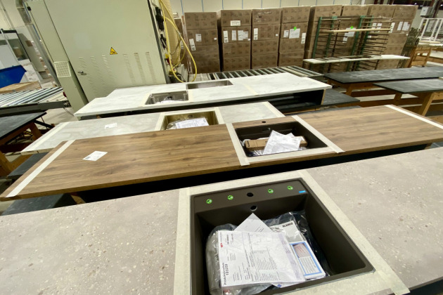 Deres produksjonsopplegg er programstyrt fra når bestillingen er registrert med alle data. Deretter overtar maskinlinjen hvor alle stasjoner i linjen kommuniserer digitalt og benkeplatene kommer ut klar for eventuell kummemontering før pakking og forsendelse. Manuell tidsbruk med den nye produksjonslinjen er redusert med ca 75%. Her ligger Foss Plater et hestehode foran europeiske konkurrenter!