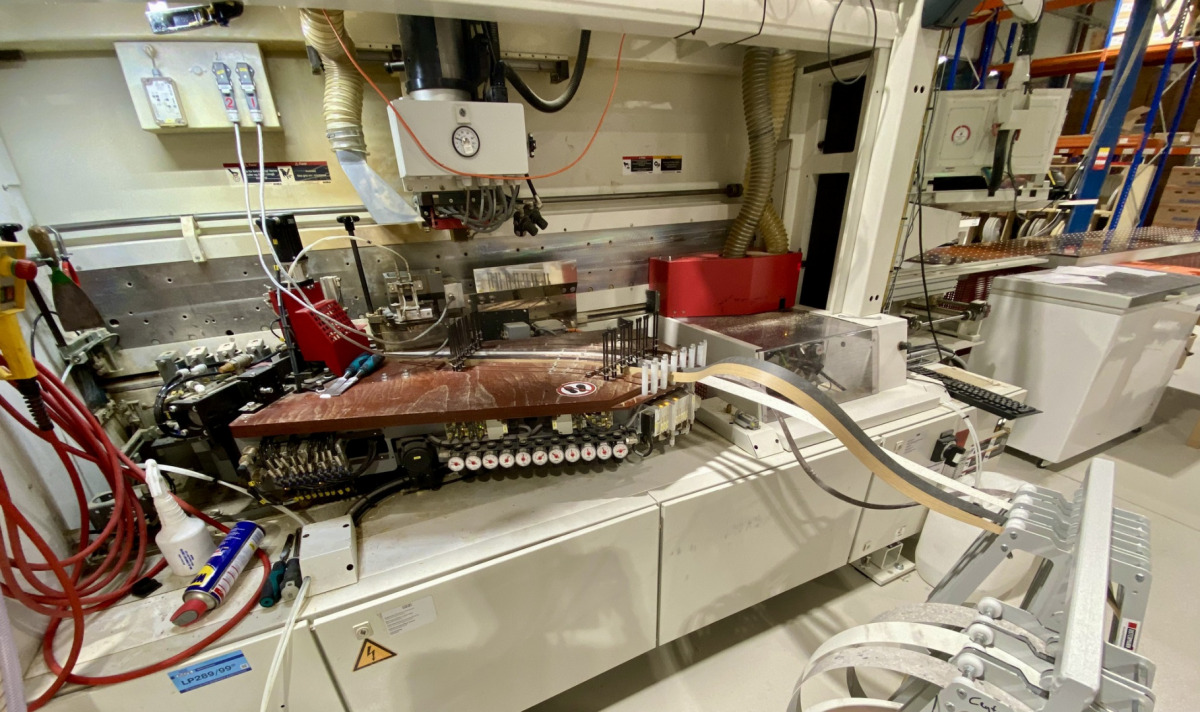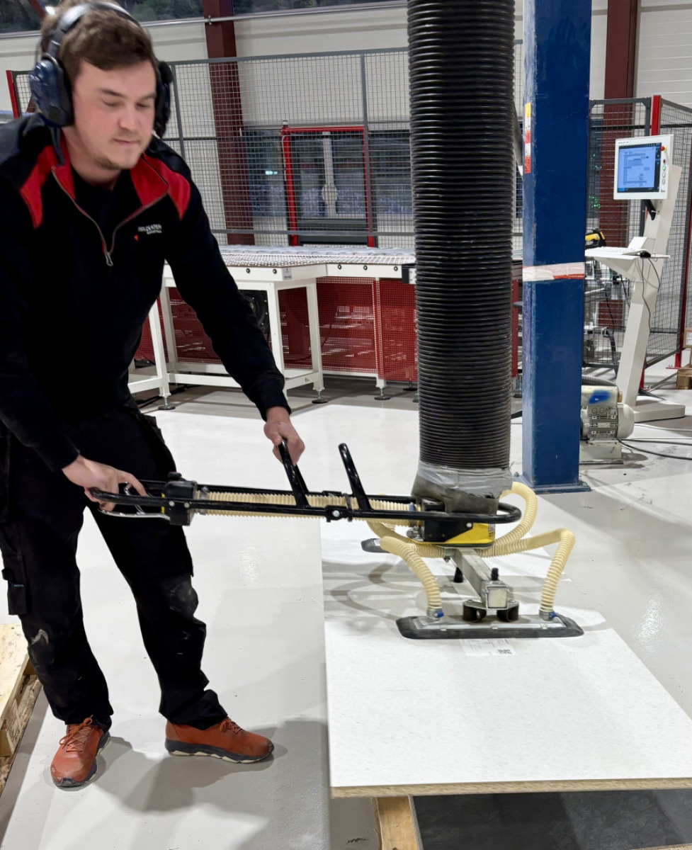 Gjestene vandret gjennom en lagerhall med god plass. Her er det planlagt et fremtidig digitalt lager, både for kjøkken- og plateproduksjon. De fortsatte til produksjonsbygget som er nylig påbygget for plass til maskiner for enda raskere produksjon av benkeplater til kjøkkeninnredninger. Mest benyttet er varmeherdet laminat og med et stort antall mønstre å velge i, men det tilbys også heltre limtreplater i forskjellige tresorter.